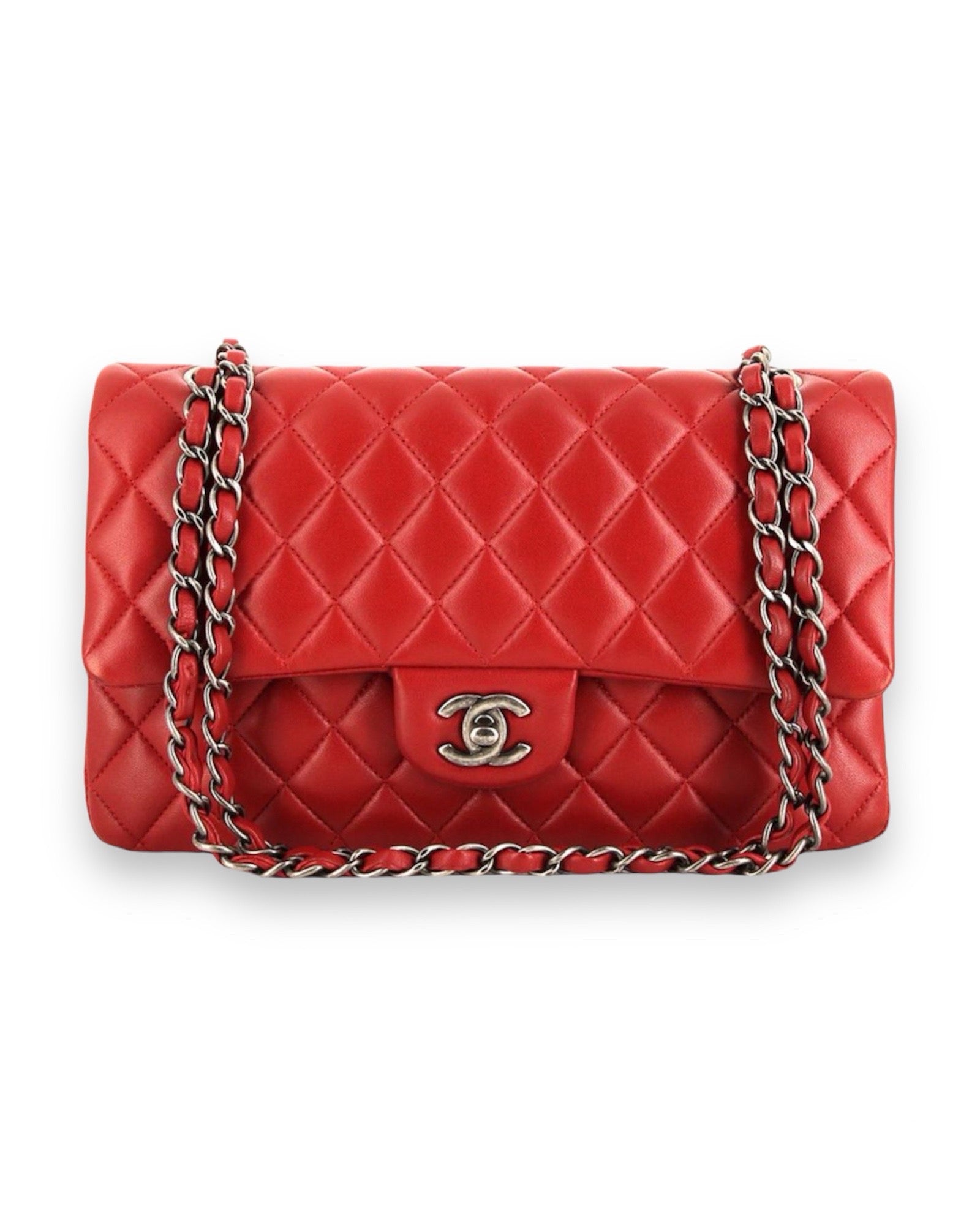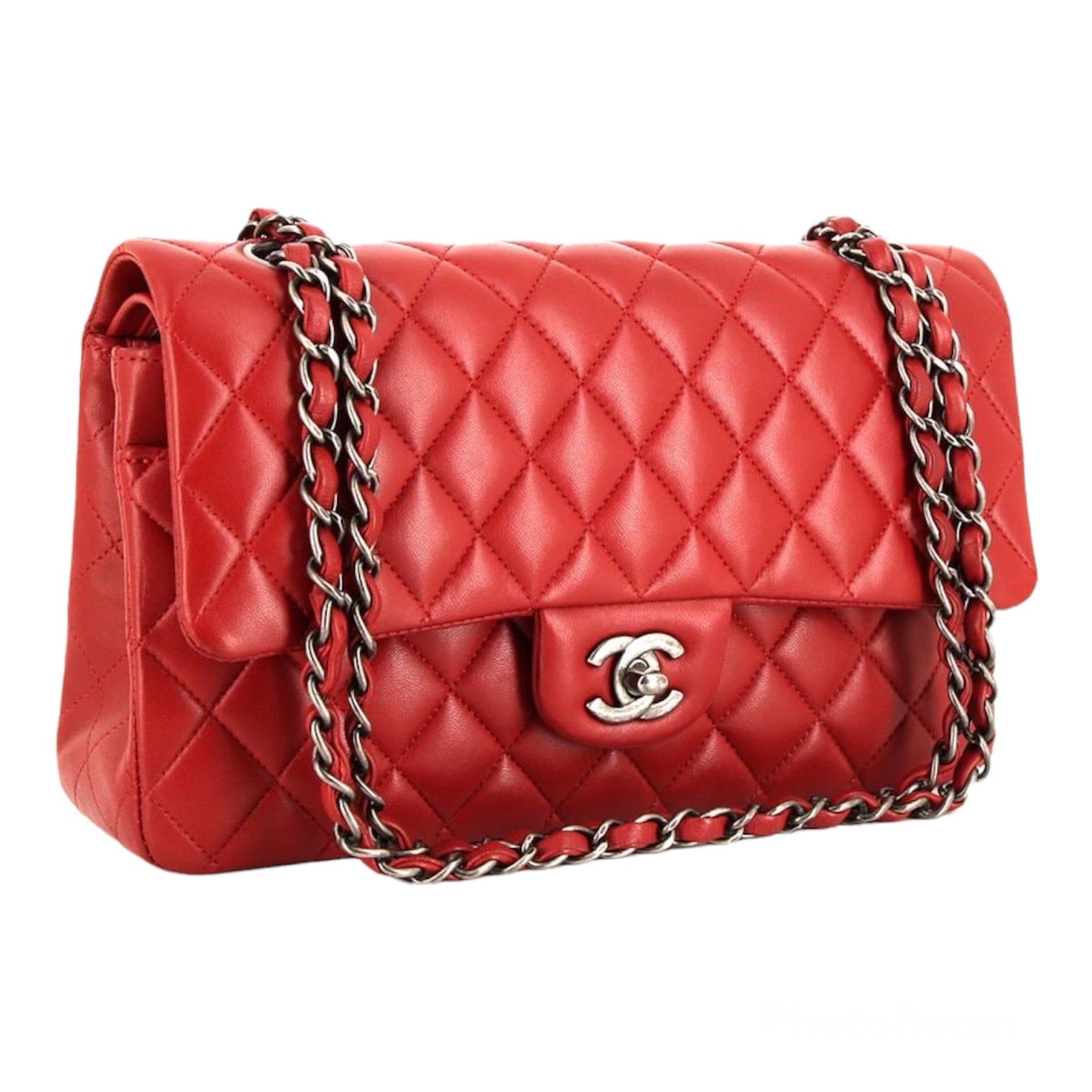 Emblématique sac à main Chanel Timeless Medium 25 à double rabat en cuir d'agneau matelassé rouge vif.