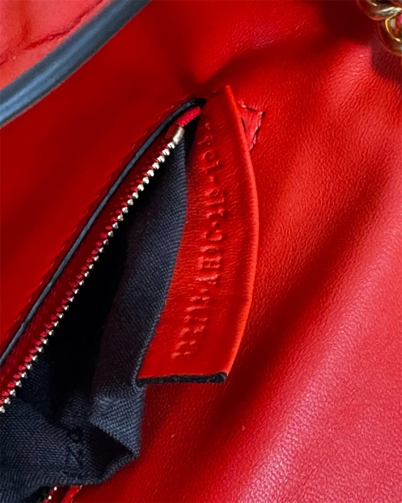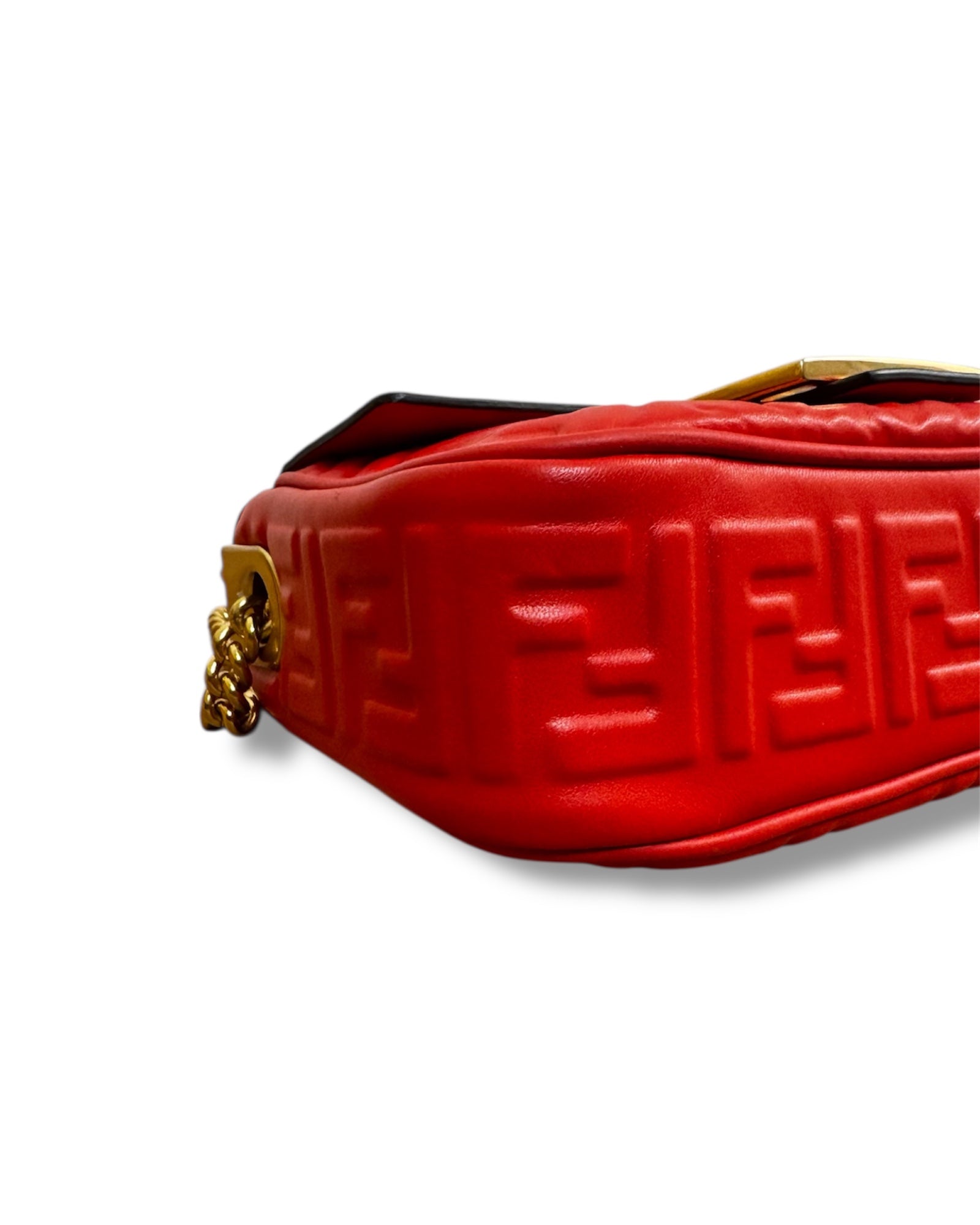 Confectionné en cuir nappa rouge Tulipano, d’une douceur exceptionnelle, il se distingue par un embossage intégral du monogramme FF, signature emblématique de la maison romaine. Son fermoir doré iconique et sa chaîne en métal brossé ajoutent une touche d’éclat sophistiqué, tandis que sa poignée supérieure offre une élégante polyvalence : porté épaule, en bandoulière ou à la main.